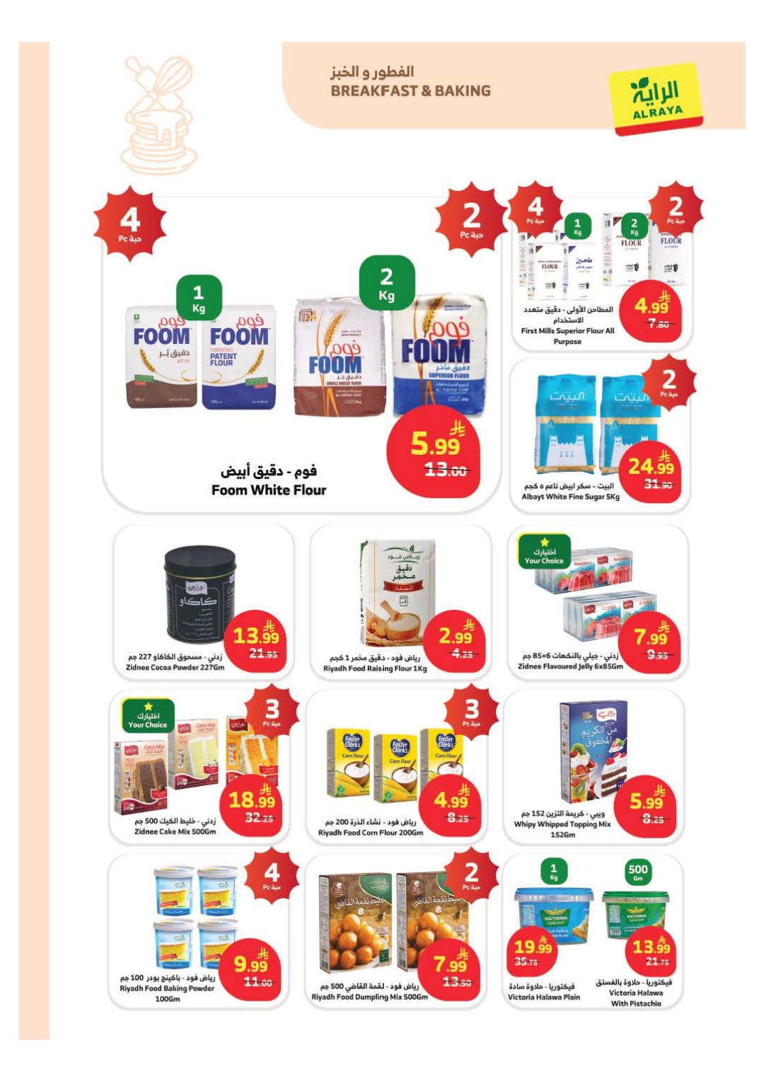 ركن الأساسيات: أسعار تنافسية على الدقيق، السكر، والحبوب.