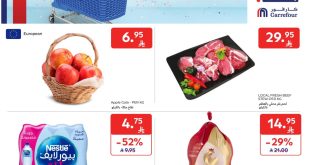 عروض كارفور اليوم رهيبة تتضمن مختلف المنتجات ذات الجودة العالية و السلع الغذائية و الطازج : حليب طازج ، البان و اجبان محلية و مستوردة ، حلوم ، بلدي ، مشلل سوري ، لبنة تركية . لحوم طازجة ، مفروم بقري برازيلي ، برجر بقري برازيلي ، كفتة بقري برازيلي ، مكعبات لحم بقري برازيلي . نقانق بقري برازيلي ، ستيك بقري برازيلي ، دجاج التنمية طبق . دجاج رضوى حليب المراعي ، حليب قليل الدسم السعودية ، شرائج دجاج بروستد ساديا ، ناجت بوب كورن السنبلة . كما هناك زبدة غير مملحة لورباك ، جبنة موزاريلا المراعي ، مرتديلا بقري / سادة ، بالزيتون حلواني .